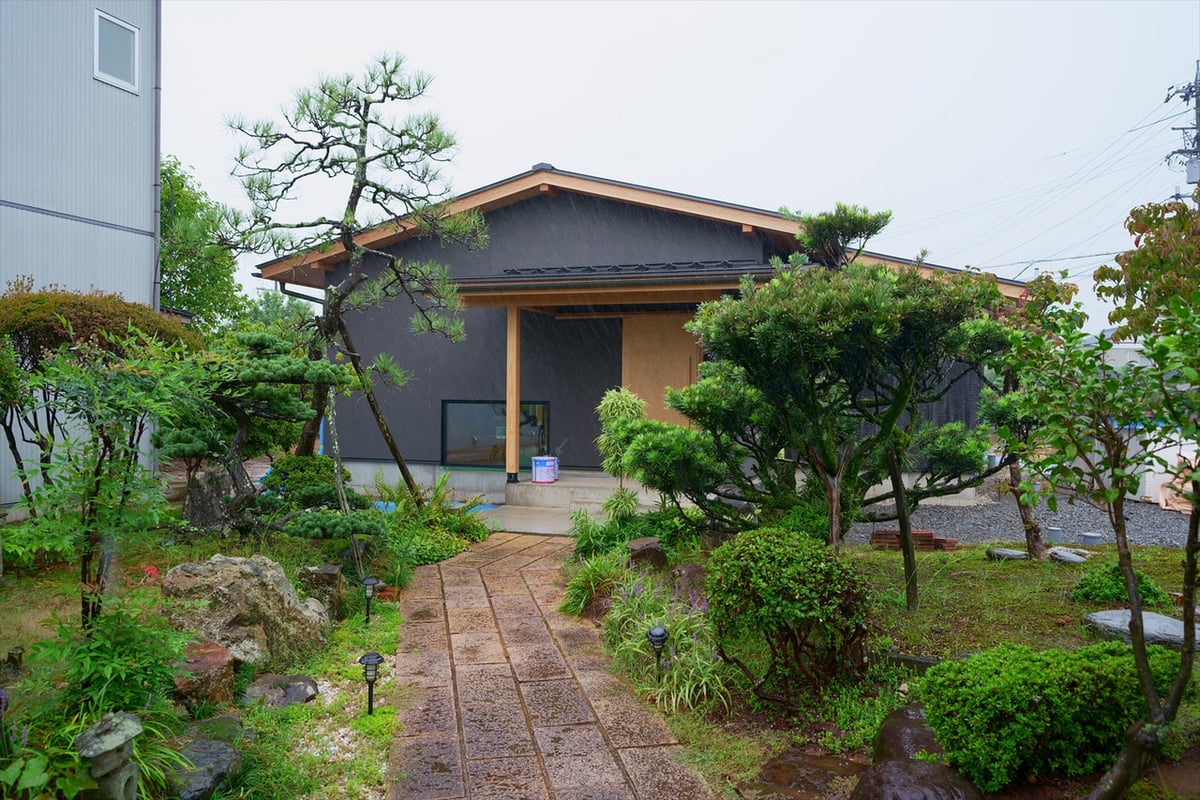 雨模様ですが外観も足場がようやく取れて全景が分かるようになりました。あとはポーチと造作玄関戸となりました。