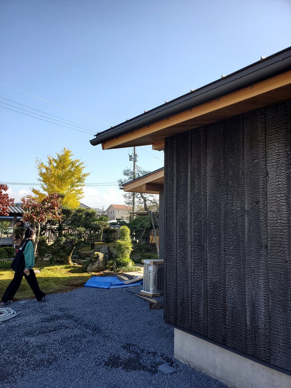 外壁は濃色の塗り壁と焼杉のコンビネーション。3方が道路に囲まれる敷地のため、低く落ち着きのある外観としました。